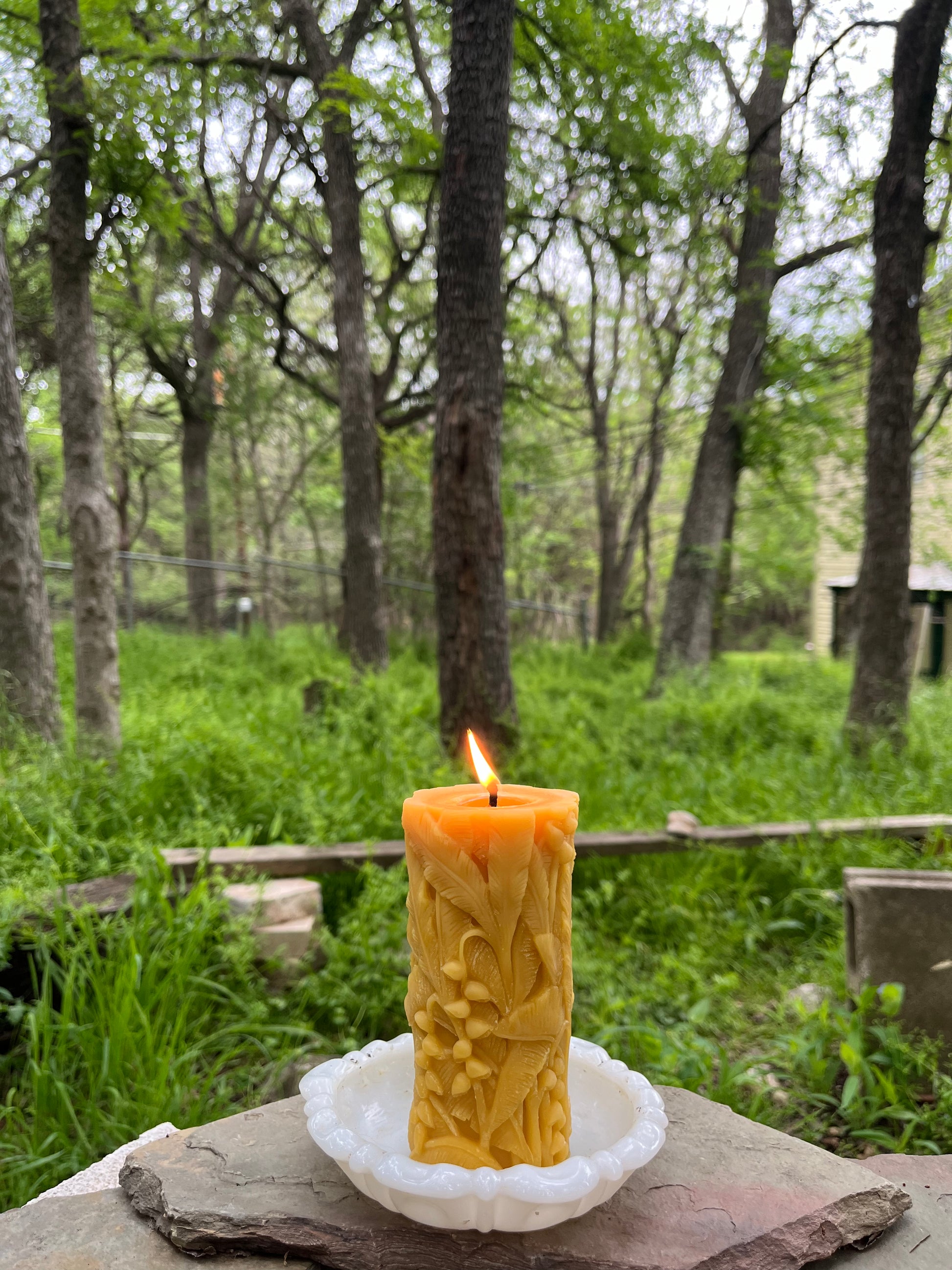 Hand made in Central Texas with high quality locally sourced beeswax. Variations are to be expected. For optimal burn, allow at least 3 hours before extinguishing. Trim wick to ¼” before lighting. Always burn on level surface and never leave a burning candle unattended.
